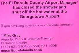 History of Sept 2003 - Jan 2003 removal of FBO..... 01/28/2003 Board of Supervisors Agenda Meeting - Georgetown Airport Services at Risk! Supervisors Solero (Tahoe), Borelli (Placerville), and Dupray (El Dorado Hills) voted against giving Skyways an interim 1 year lease. After some argument, it was then agreed to allow Skyways to remain for 90 days while the County puts out a new RFP. Charlie Paine made a motion, with Helen Baumann seconding, to accept a proposed interim 12 month FBO lease that had been worked out among Steve and Trish Cimmarusti, County Counsel, Risk Management, and General Services. It was voted down 3 to 2 (Solaro, Borelli, and Dupray voted against). Three Supervisors outside our district determine what happens inside our district. Email them and ask why! (recent history and addresses below) History of the Fall 2002 Troubles: The El Dorado County Supervisors voted in closed session not to renew the Airport lease to Skyways, owned and operated by Steve and Trish Cimmarusti. After 10 years of hard work and quality service to our community and others, Skyways had been notified to vacate the airport by Dec 7th. The Supervisors acted without input from the Georgetown Airport Advisory Committee and the Community at large! Please email or phone all of our supervisors and share your wishes or opinions regarding this issue. Timeline: