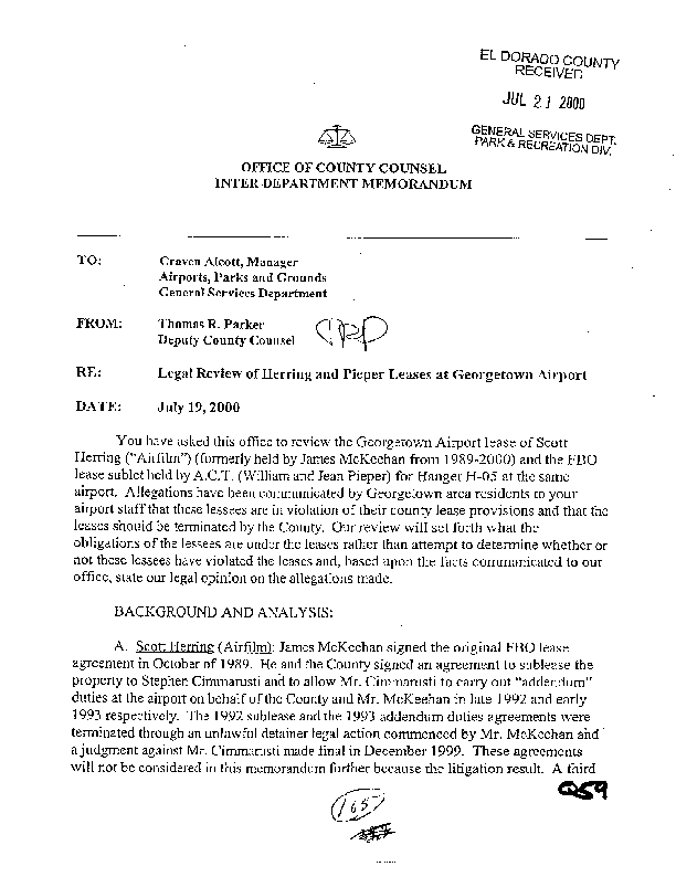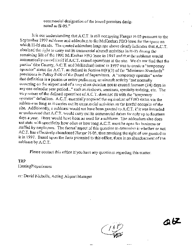 A. McKeehan signed FBO sublease Oct 1989. Sublease to have Steve C. to do addendum duties terminated 12/99 due to legal action of McKeehan. Another addendum was executed on 5/17/95. On 4/25/00 County approved McKeehan lease assignment to Scott Herring.