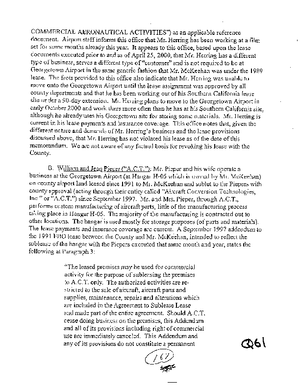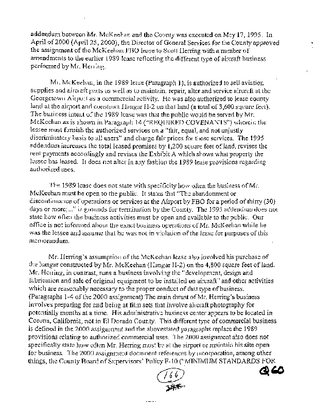 In McKeehan '89 lease he was authorized to do certain things, to lease County land, and to construct hangar H-2 on it. His business intent was to serve the public - authorized service, non-discriminatory, with a fair price. '95 addendum increases leased premises and revises rent payments accordingly.