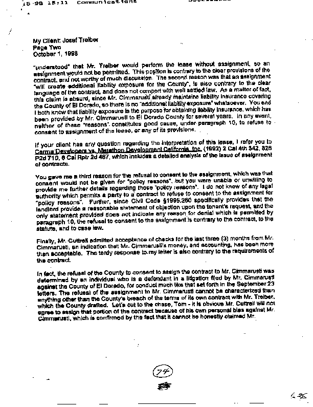 3. Such a consent for the assignment would not be given for "policy reasons" (again contrary to law and without any reason for the "policy"). Letter also stated that the refusal of the county to assign the contract was determined by an individual who was a defendant in a litigation filed by Steve against the County, and that this was breach of contract by the County showing personal bias against Steve.